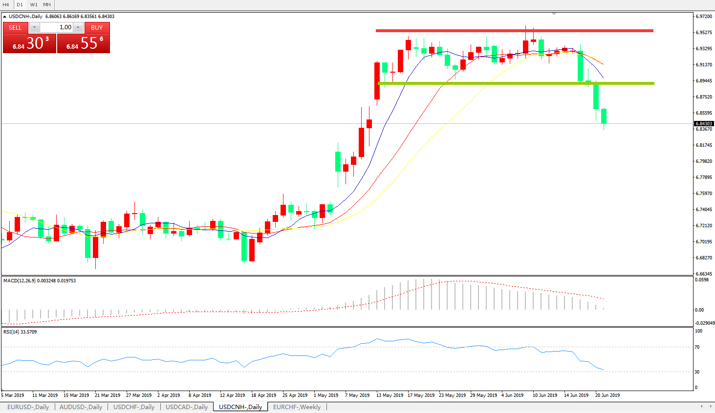技术面简析:日线图均线发散下行,MACD逼近0轴且动能柱持续缩量,RSI逐步走低,预计短期汇价有继续回落需求,贸易争端缓解及G20乐观预期推动,汇价大概率将进一步走低。