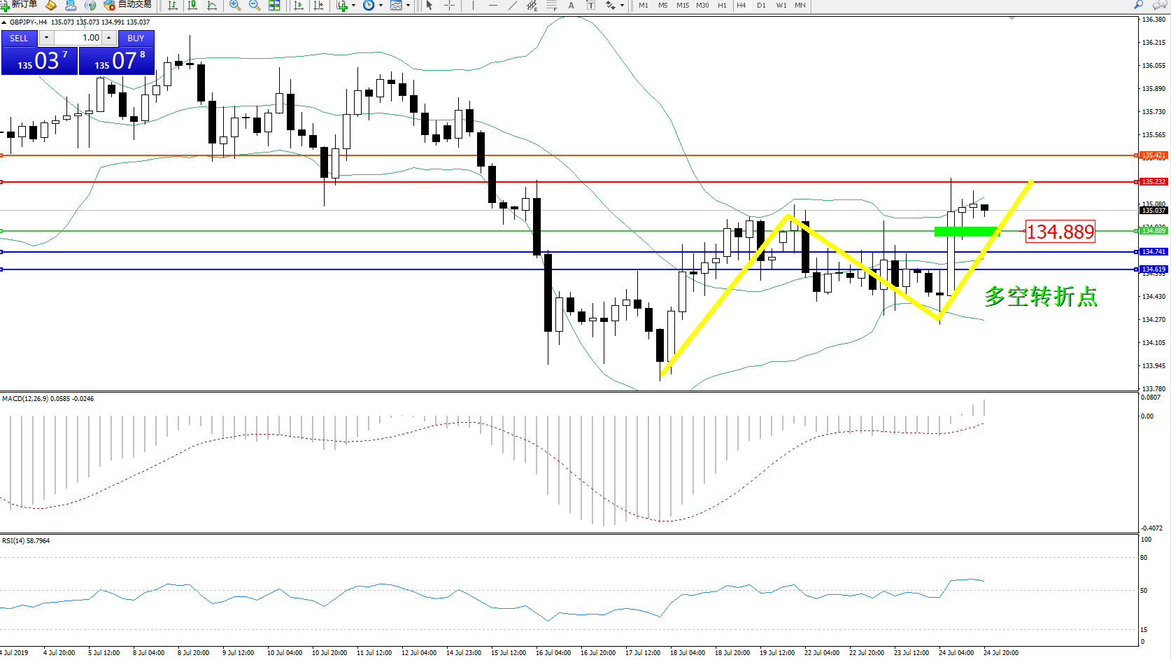 交易策略:134.889上方看涨,目标135.232135.421