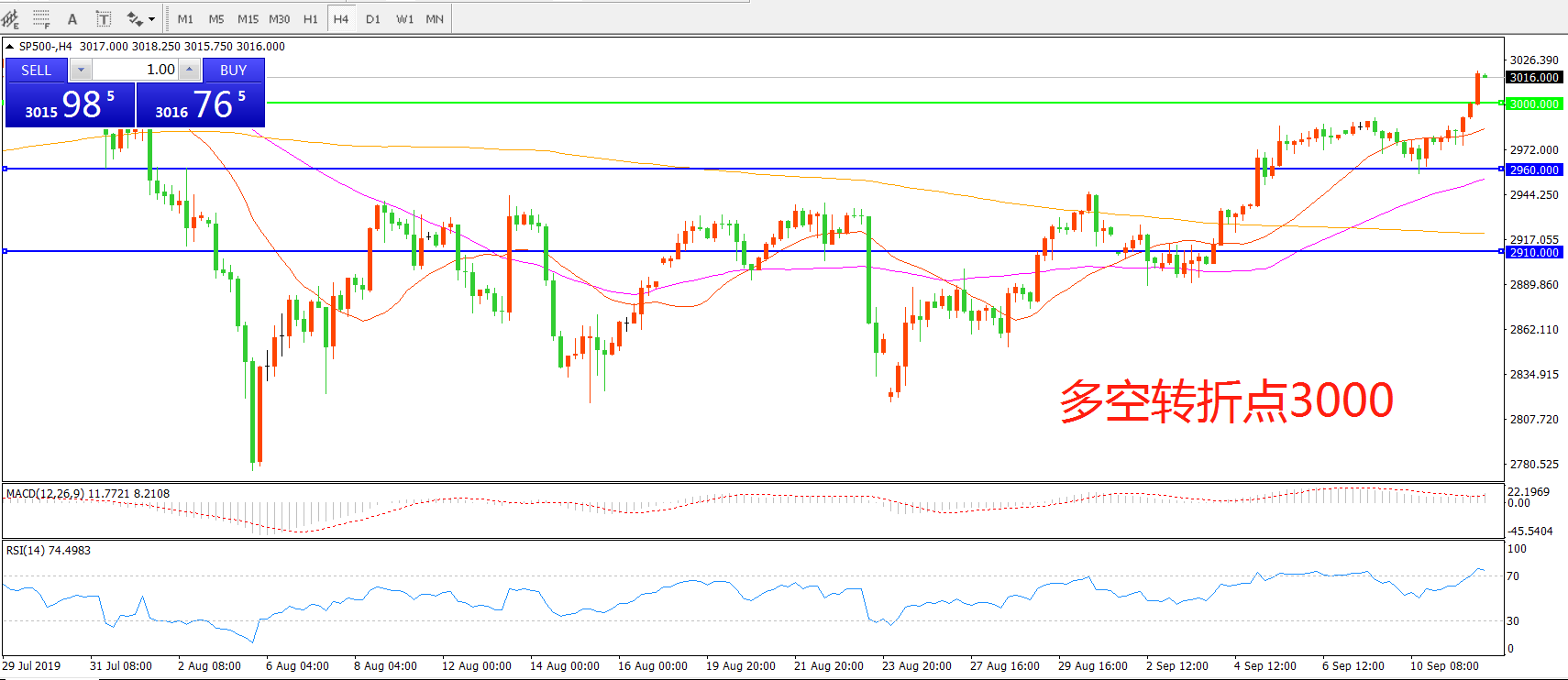4小时图看,标普500延续高位整理形态,波幅逐渐收窄,2960支撑依然稳固,均线系统呈多头排列,MACD红柱增加,RSI指标走平,日内延续上行概率较大。