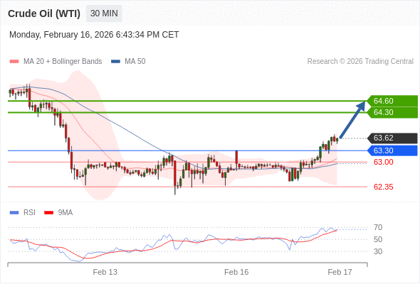 在 63.30 之上,看涨,目标价位为 64.30 ,然后为 64.60 。