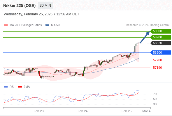 在 58200 之上,看涨,目标价位为 59200 ,然后为 59600 。