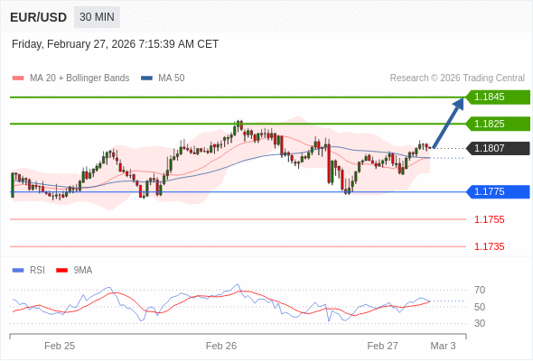 在 1.1775 之上,看涨,目标价位为 1.1825 ,然后为 1.1845 。