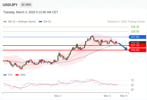 在 157.65 之下,看跌,目标价位为 157.10 ,然后为 156.80 。