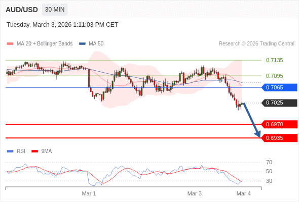 交易策略: 在 0.7065 之下,看跌,目标价位为 0.6970 ,然后为 0.6935 。