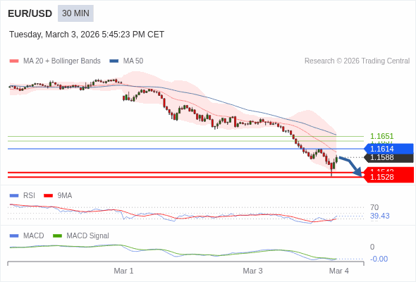 欧元/美元 当日内 : 看跌,在 1.1614 之下。