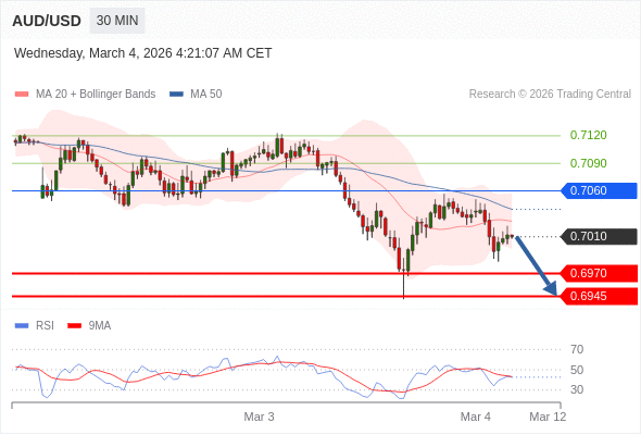 交易策略: 在 0.7060 之下,看跌,目标价位为 0.6970 ,然后为 0.6945 。
