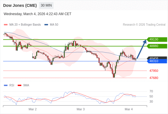在 48310 之上,看涨,目标价位为 48880 ,然后为 49130 。