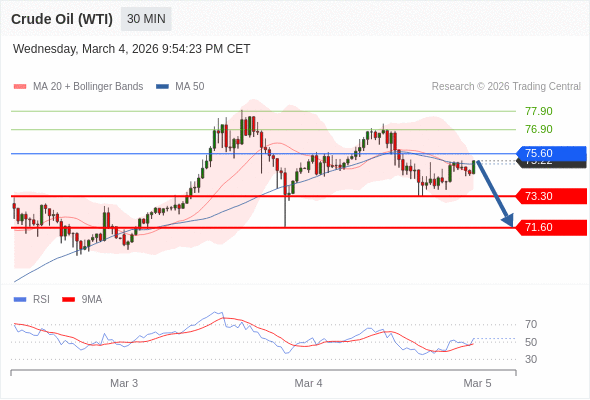 交易策略: 在 75.60 之下,看跌,目标价位为 73.30 ,然后为 71.60 。