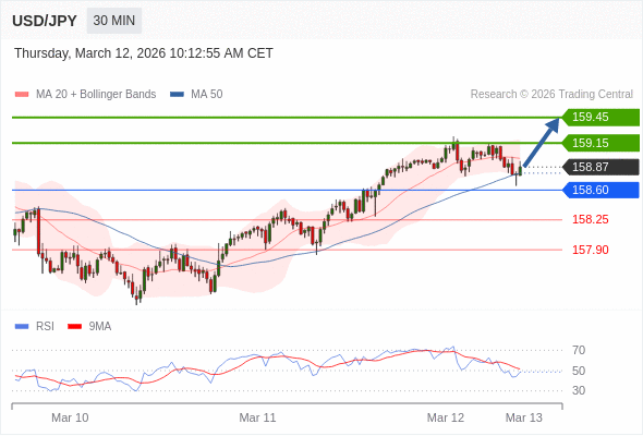 在 158.60 之上,看涨,目标价位为 159.15 ,然后为 159.45 。