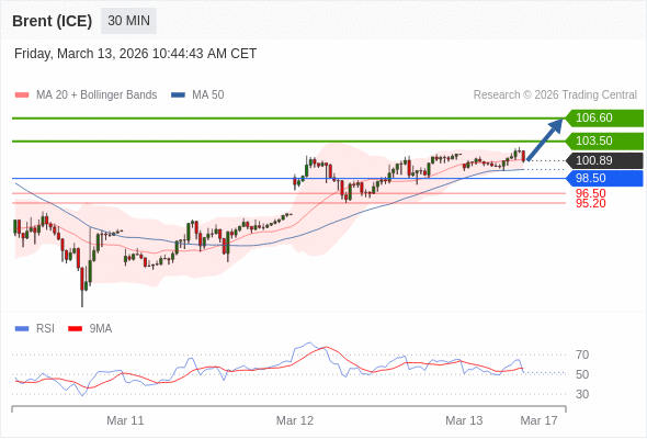 布伦特原油 (ICE) (K6) 当日内: 在98.50之上,看涨。