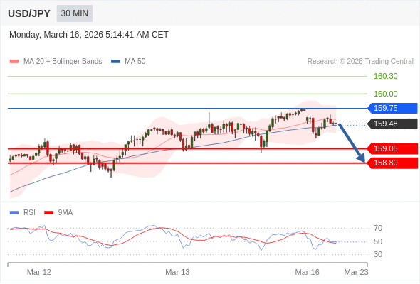 交易策略: 在 159.75 之下,看跌,目标价位为 159.05 ,然后为 158.80 。