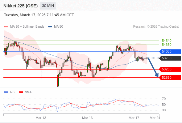 在 54050 之下,看跌,目标价位为 53260 ,然后为 52890 。