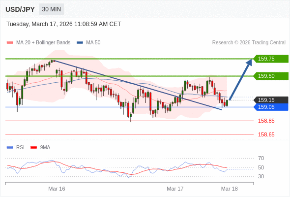 在 159.05 之上,看涨,目标价位为 159.50 ,然后为 159.75 。
