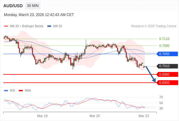 交易策略: 在 0.7055 之下,看跌,目标价位为 0.6980 ,然后为 0.6950 。