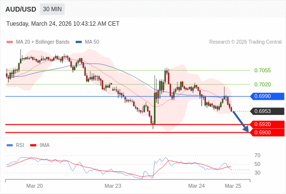 在 0.6990 之下,看跌,目标价位为 0.6920 ,然后为 0.6900 。