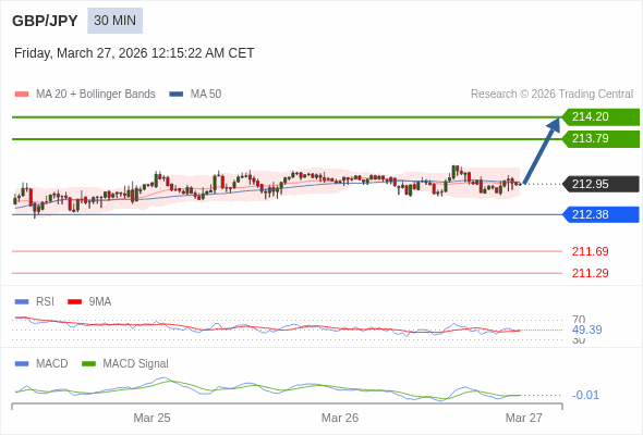 英镑/日元 当日内 : 有上涨的可能,目标价位定在 214.20 。