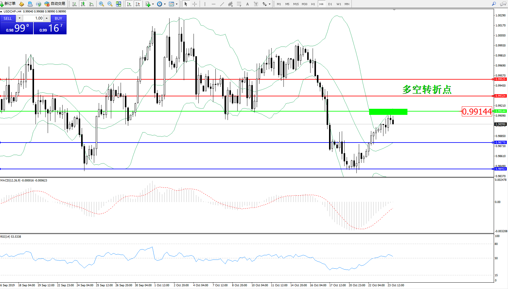交易策略:0.99144下方看跌,目标0.98770、0.98453