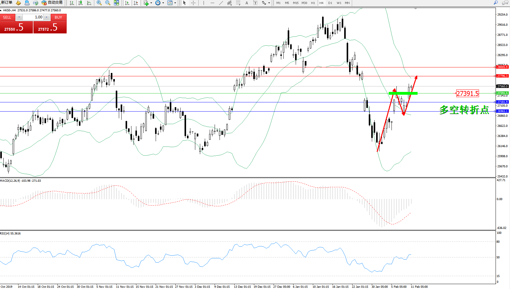 恒指HK50 ——4小时K线图显示: