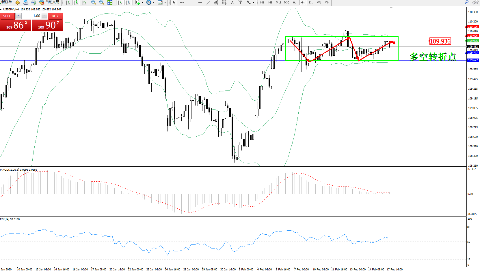 交易策略:109.936下方看跌,目标109.777109.677