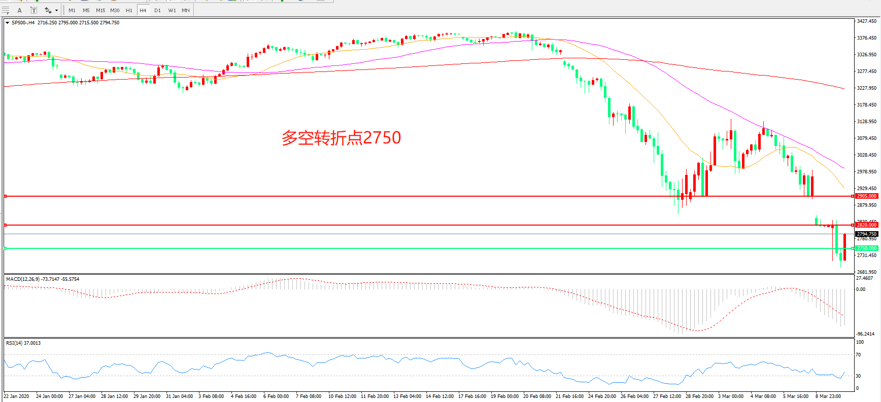 4小时图看,标普500低开低走,虽有小幅反弹,但整体表现仍然低迷,均线系统呈空头排列,MACD绿柱增加,RSI指标向下,日内延续下行概率较大。