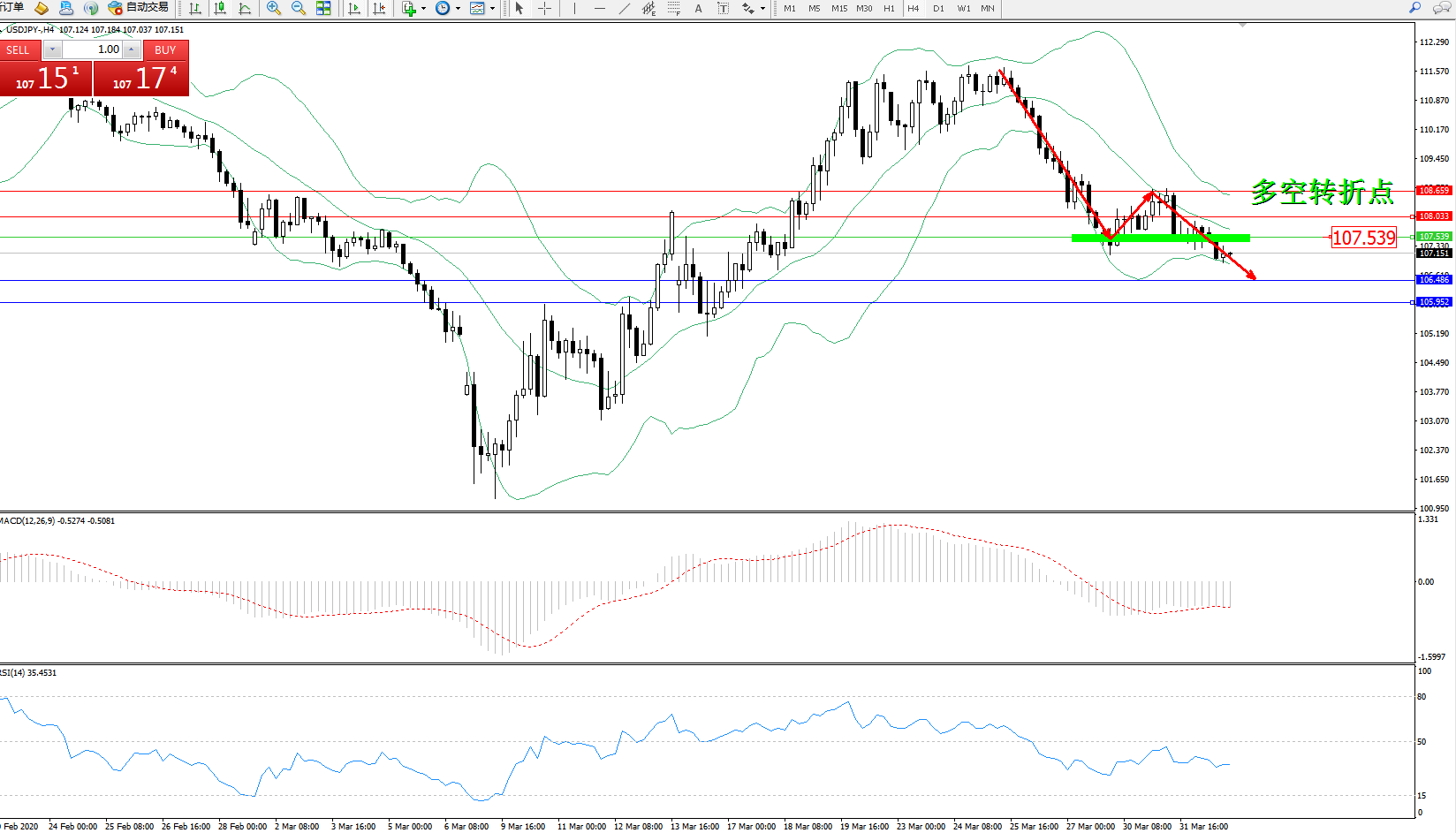 交易策略:107.539下方看跌,目标106.486、105.952