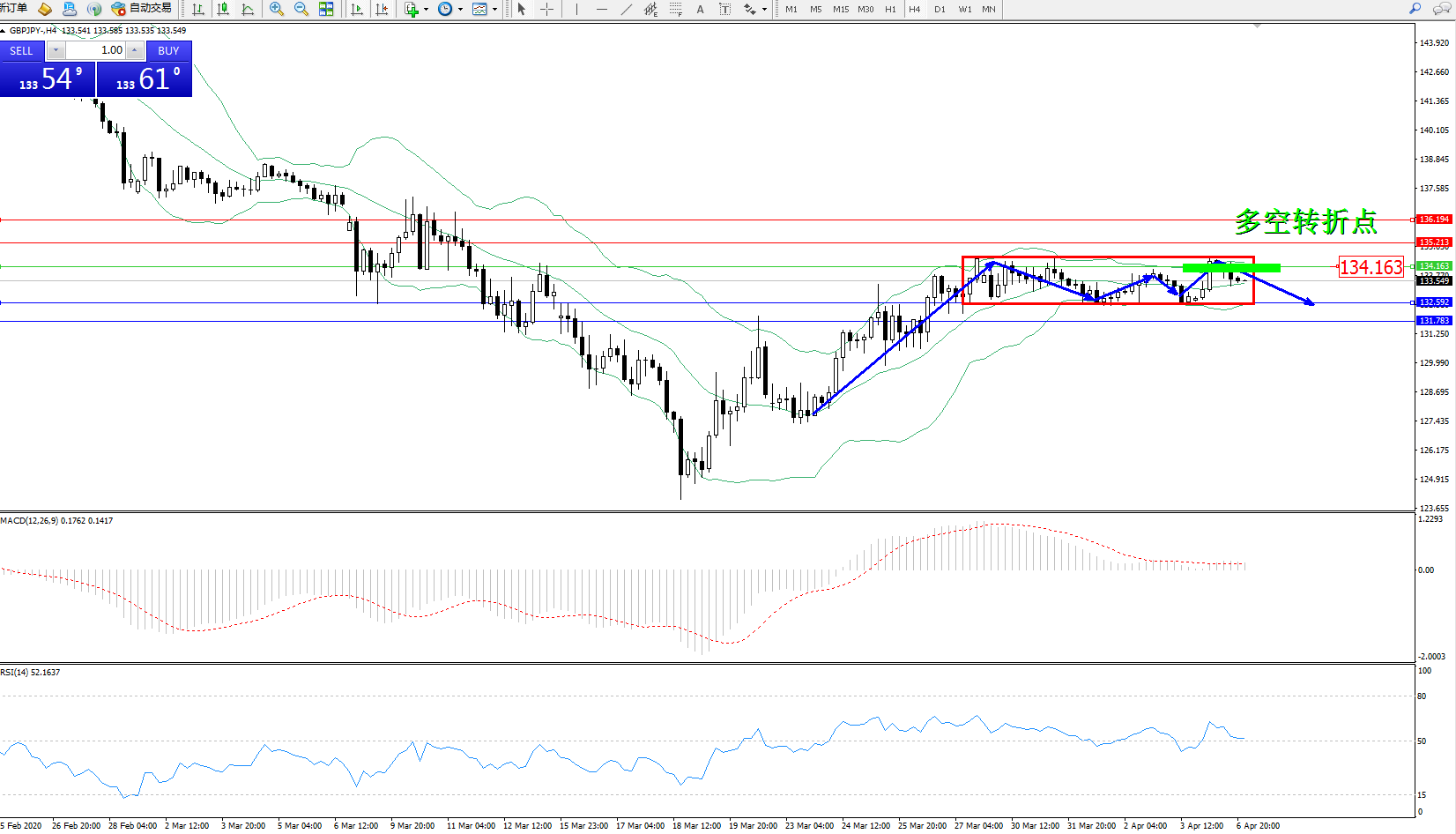 交易策略:134.163下方看跌,目标132.592、131.783