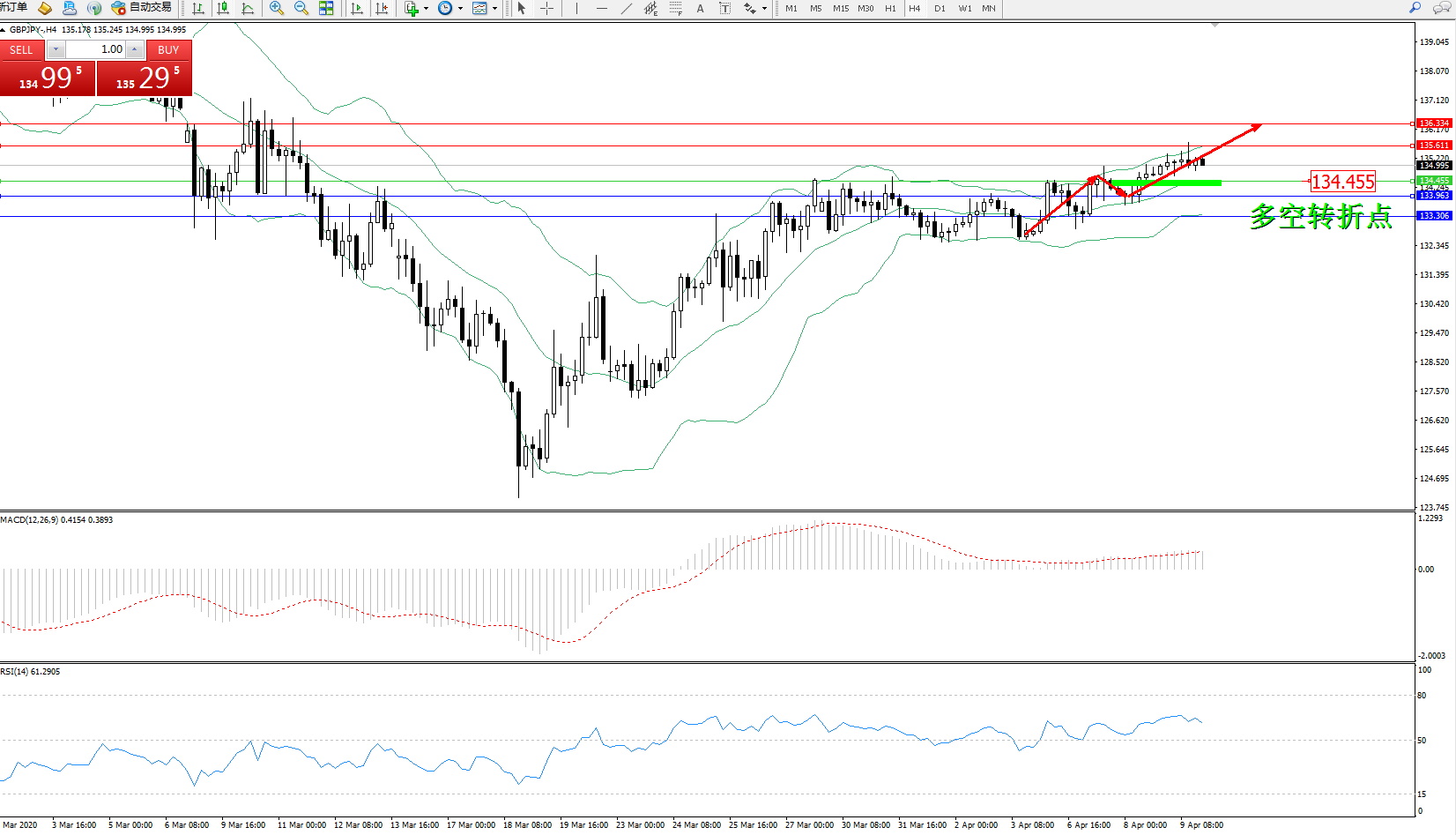 交易策略:134.455上方看涨,目标135.611136.334