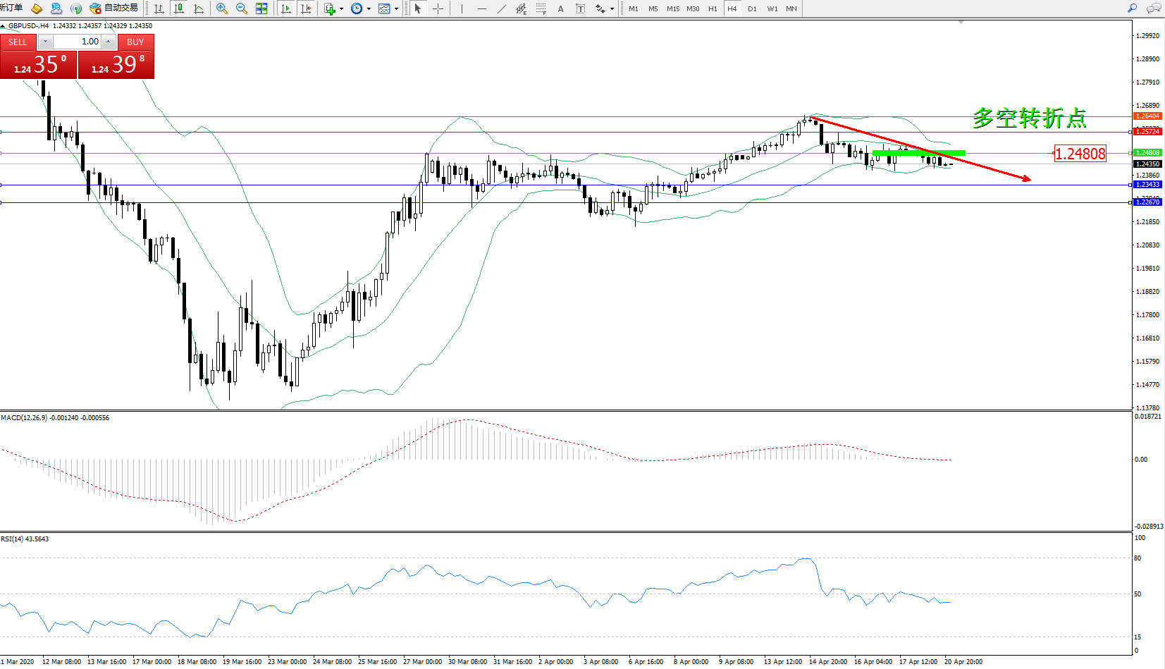 交易策略:1.24808下方看跌,目标1.23433、1.22670
