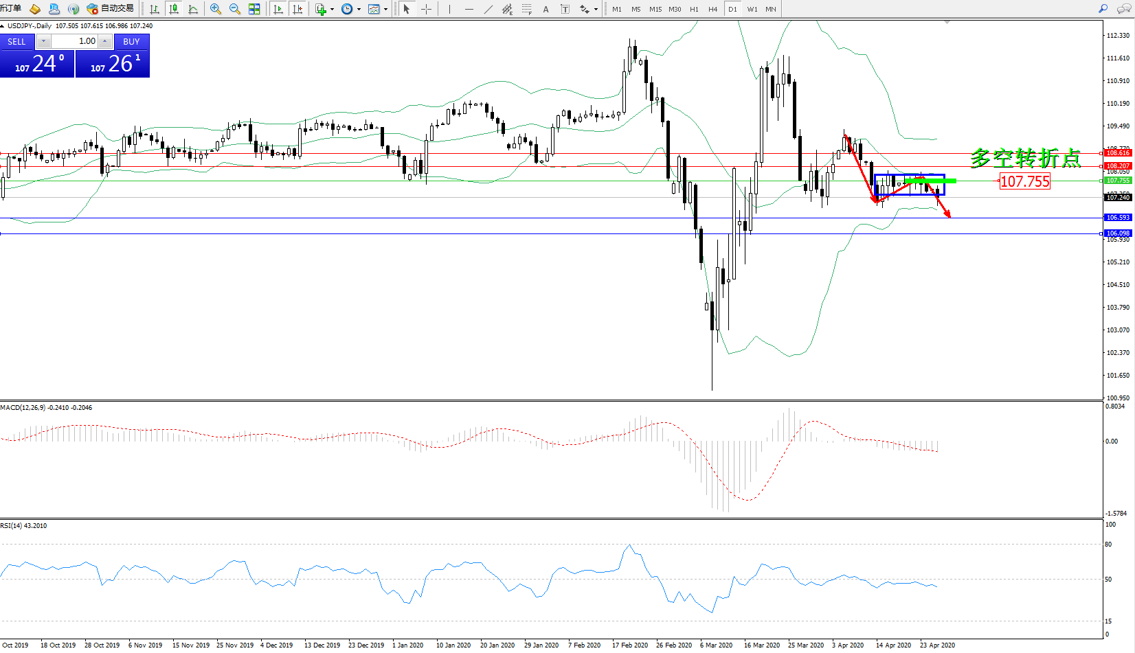 交易策略:107.755下方看跌,目标106.593、106.098