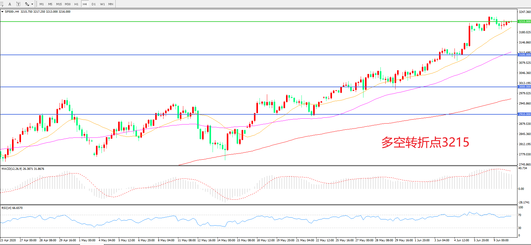 4小时图看,标普500长阳拉升,整体表现十分强势,均线系统呈多头排列,MACD红柱增加,RSI指标走平,日内延续上行概率较大。