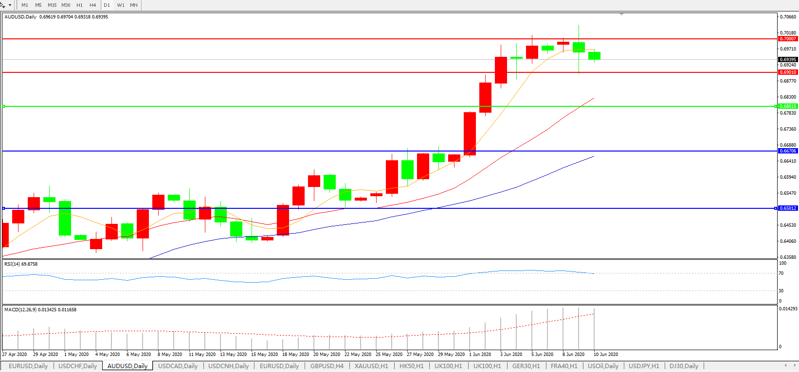 技术面简析:日图均线呈有序多头排列但短期均线开始拐头,汇价冲击0.70关口后乏力开始下行,MACD运行于0轴上方且量能放量,RSI超卖区域开始走弱,预计汇价大概率将下行修正,短期关注下方0.69关口攻守。