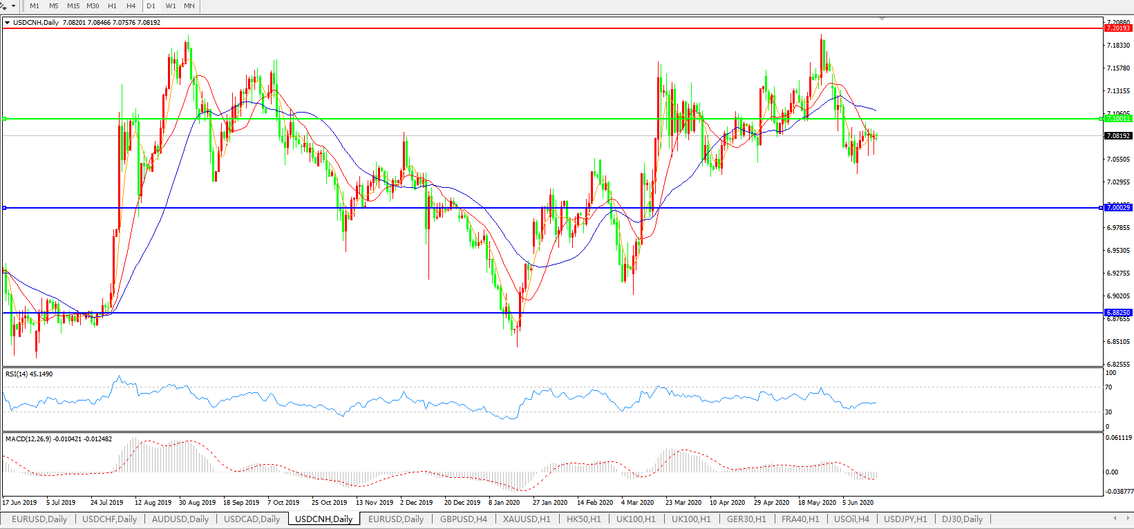 技术面简析:日图均线呈有序空头排列,汇价7.10关口下方窄幅整理,MACD下穿0轴但量能0轴下小幅缩量,RSI小幅反弹后有走弱迹象,预计短期汇价或将进一步下行,关注7.10关口压制。