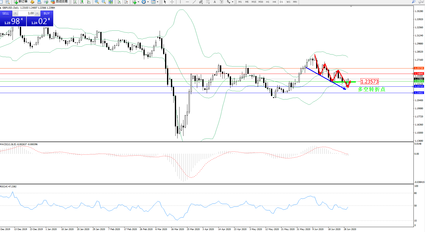 交易策略:1.23573上方看涨,目标1.24840、1.25739