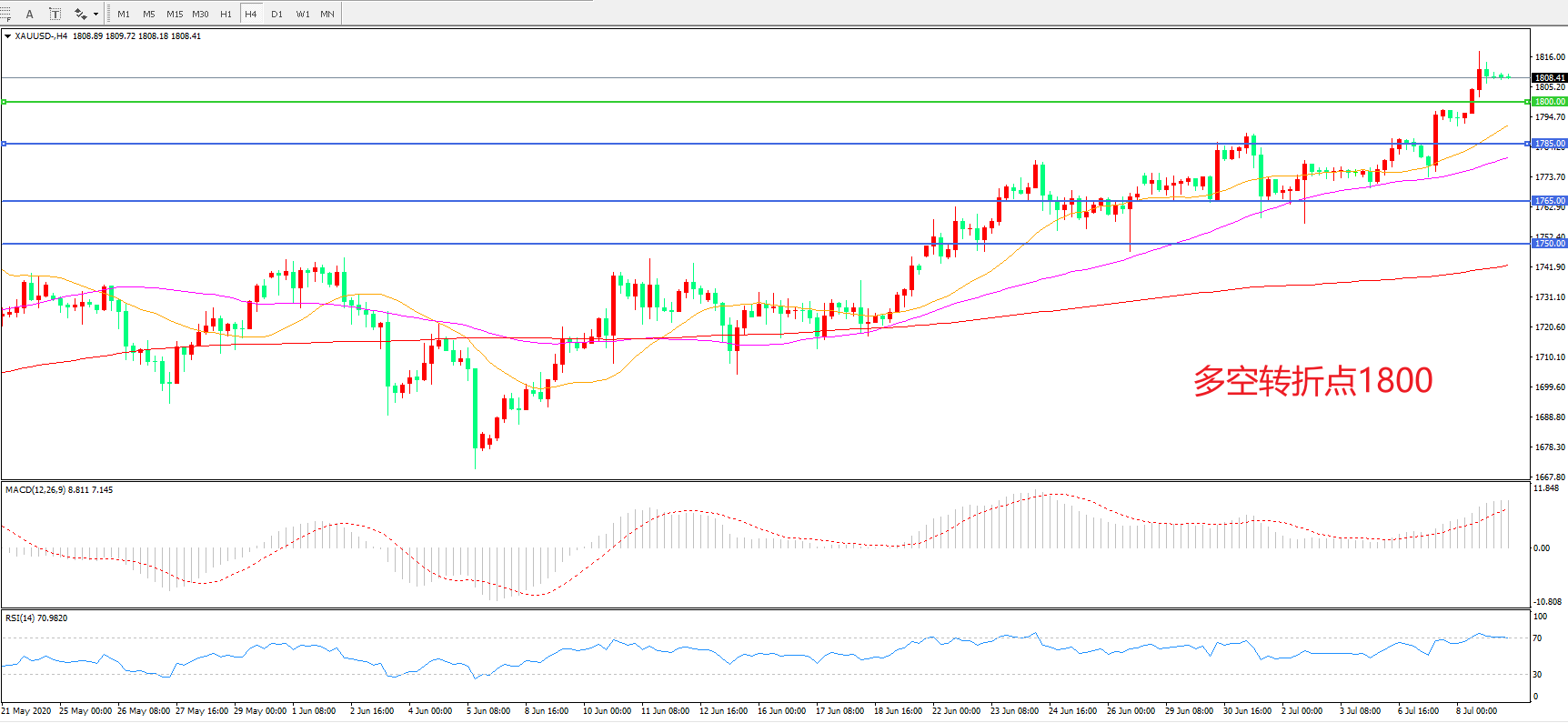 交易策略:在1800.00之上看涨,目标1820.00 1845.00