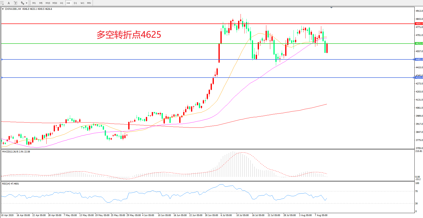4小时图看,沪深300长阴下破后震荡反弹,短期走势低迷,4625被跌破后,下方4485成为焦点,如果跌破有,有形成双头走势可能,均线系统走平, MACD红柱缩短,RSI指标向上,日内延续震荡概率较大。