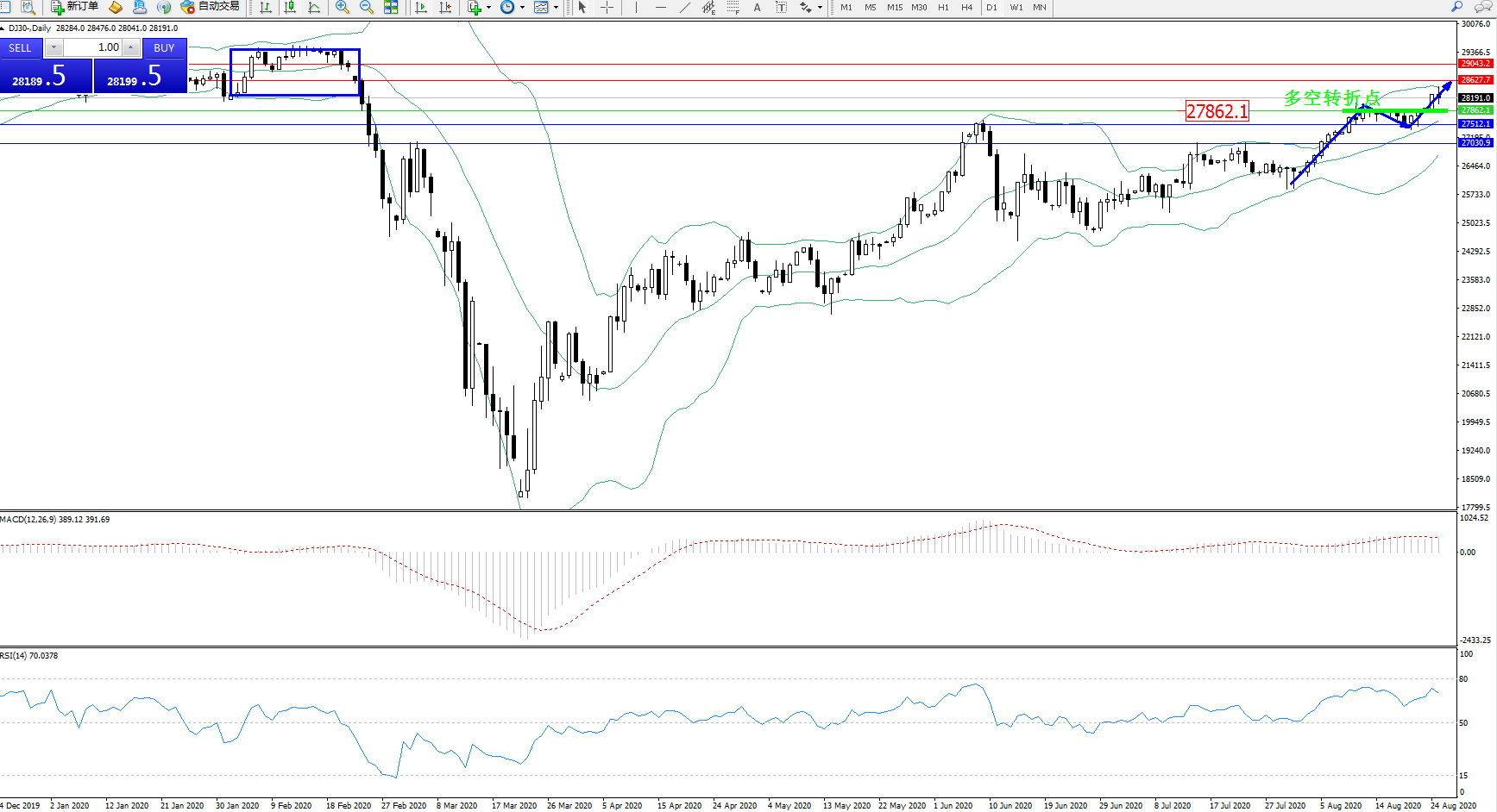 道琼斯指数DJ30—— 日K线图显示:
