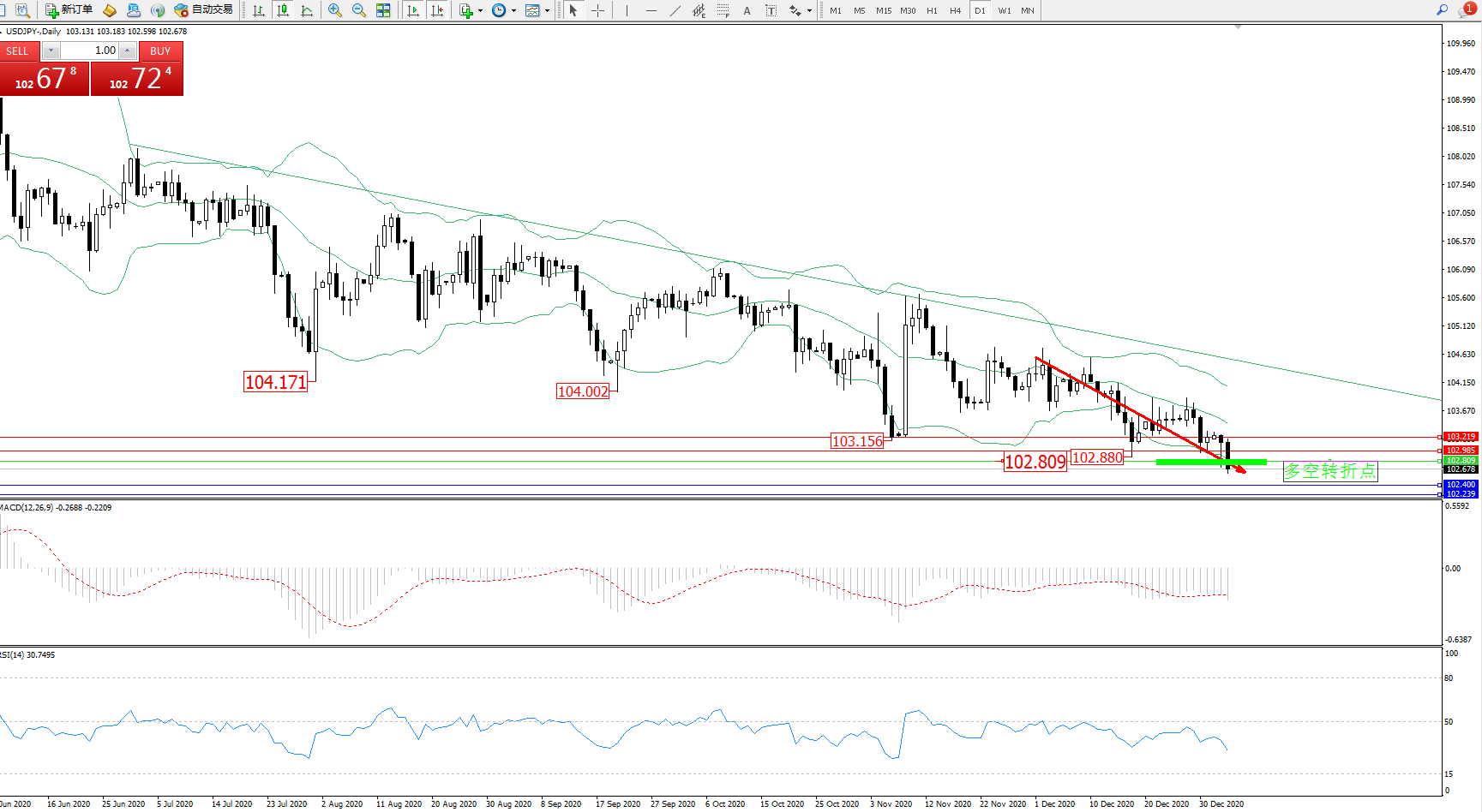 技术点评:空头动力延续布林带指标通道内中下轨区间持续震荡下行态势良好,底部跌破前期低位102.880位置持续下行中,再度持续向下移动态势良好,纠结于布林带指标中下轨区间整理,布林带指标呈收口走势持续向下移动中,MACD指标处于0轴线下方空头区域维持整理平移中,RSI指标处于50均衡线下方空头区域维持窄幅整理有继续下移迹象;