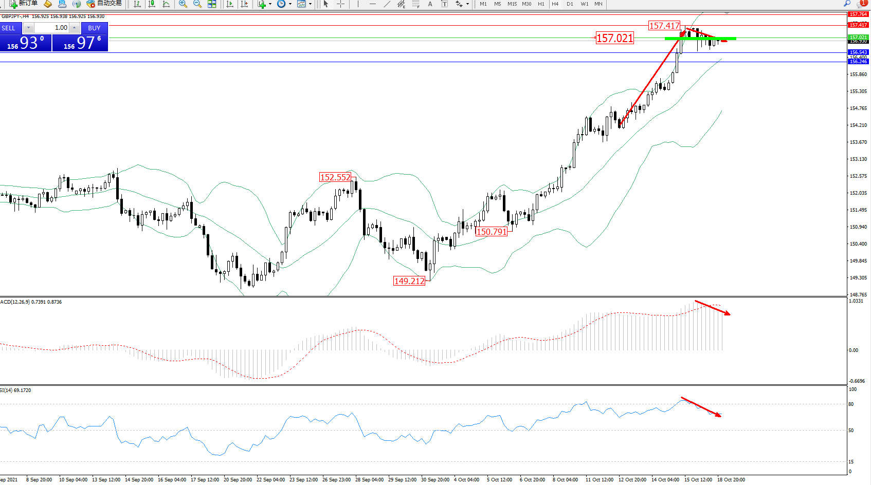 备选策略:157.021上方看涨,目标157.417、157.764