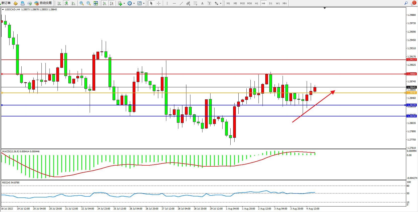 美元加元USDCAD——4小时K线图显示: