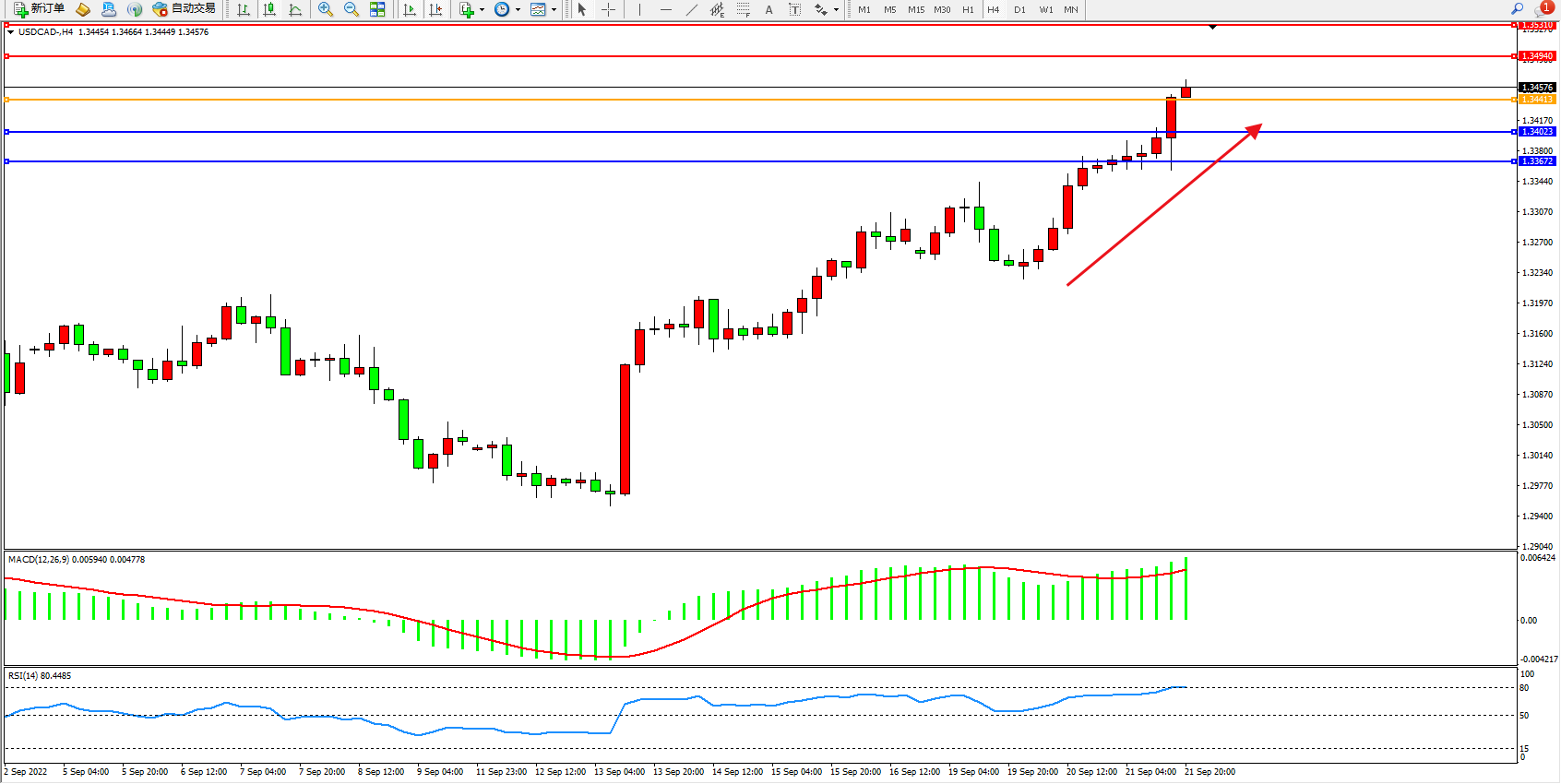 美元兑加元维持1.34576附近震荡,美联储第三次将其目标利率提高了75个基点,达到3.00-3.25%的区间,并暗示将有更多的大规模加息。股票和石油等风险资产受此消息影响而下跌,而美元则反弹。