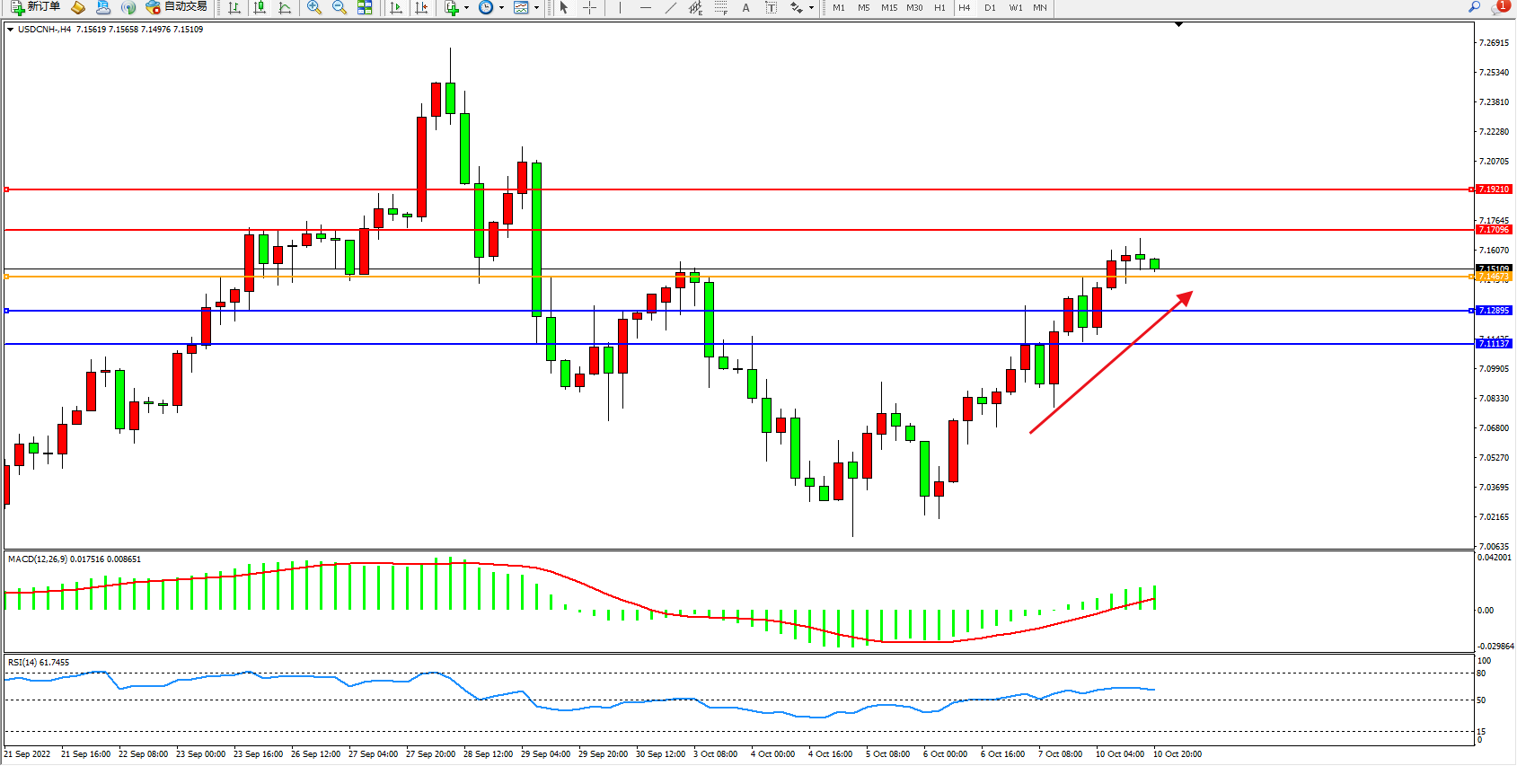 美元人民币USDCNH——4小时K线图显示: