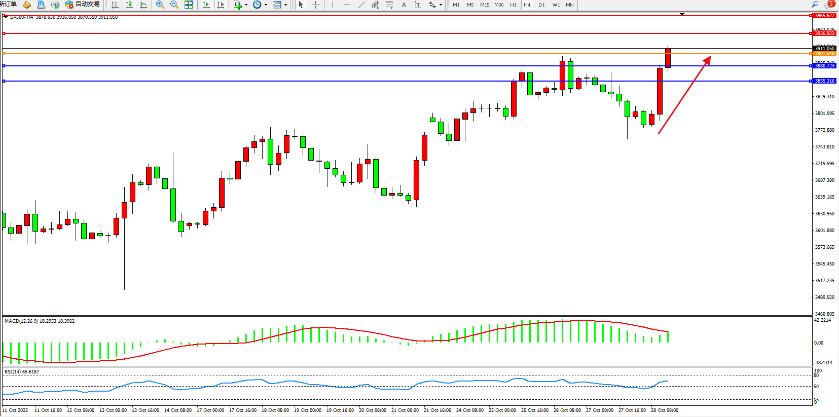 标普SP500——4小时K线图显示: