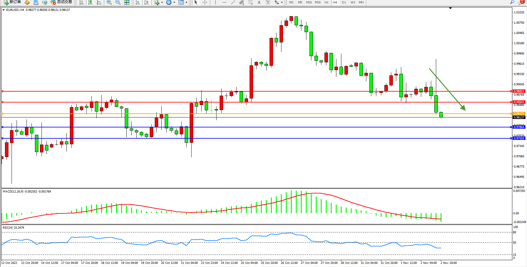 交易策略:0.98233下方看跌,目标0.97864、0.97555