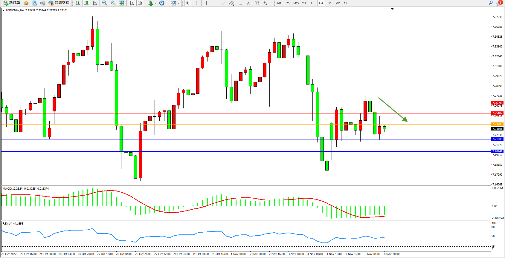 交易策略:7.23703下方看跌,目标7.21805、7.20241