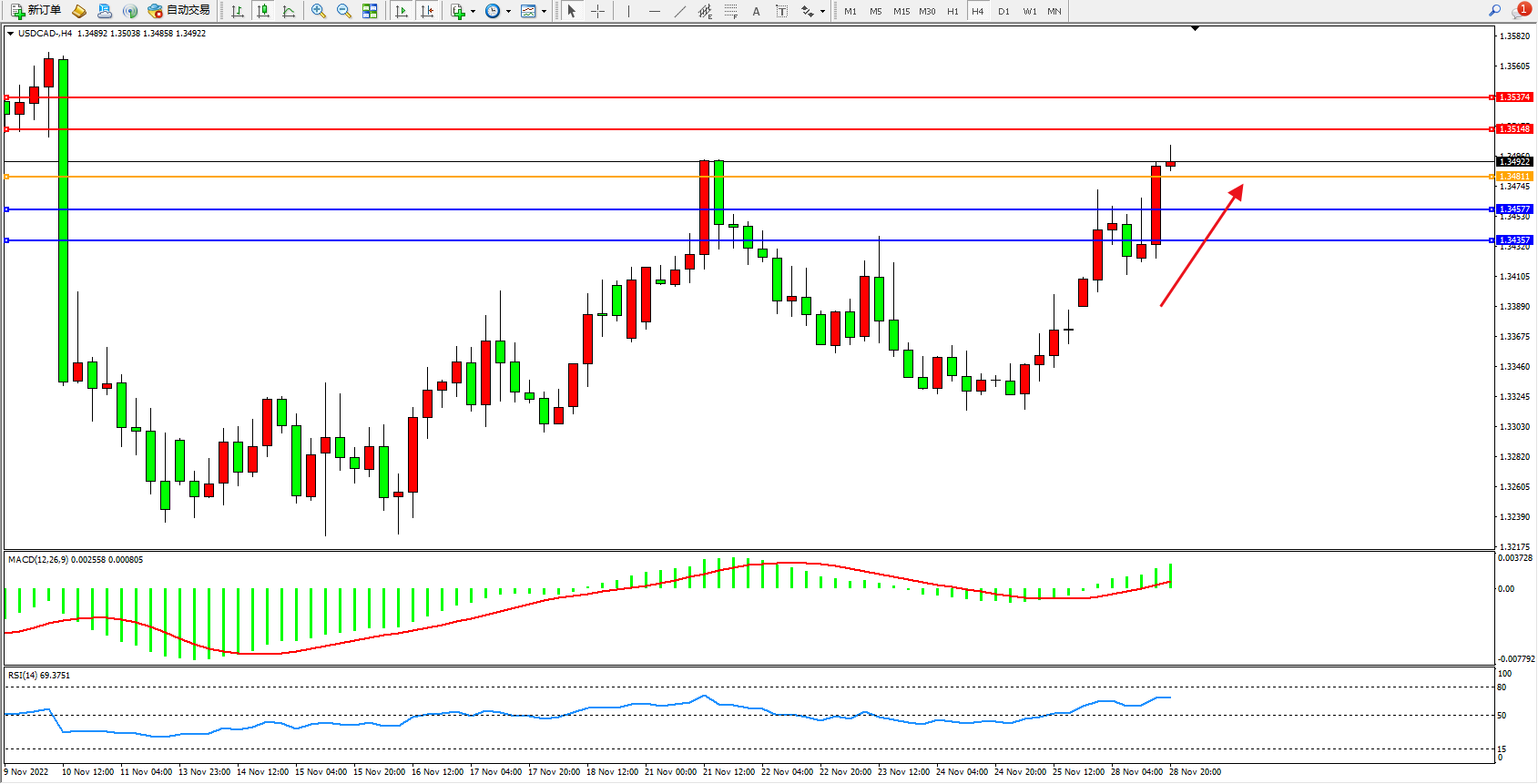 美元加元USDCAD——4小时K线图显示: