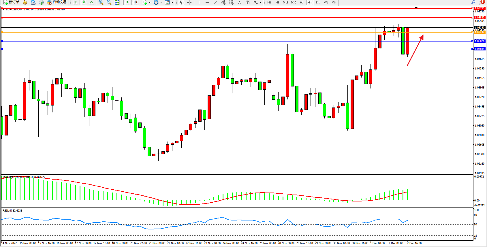 欧元美元EURUSD—4小时K线图显示: