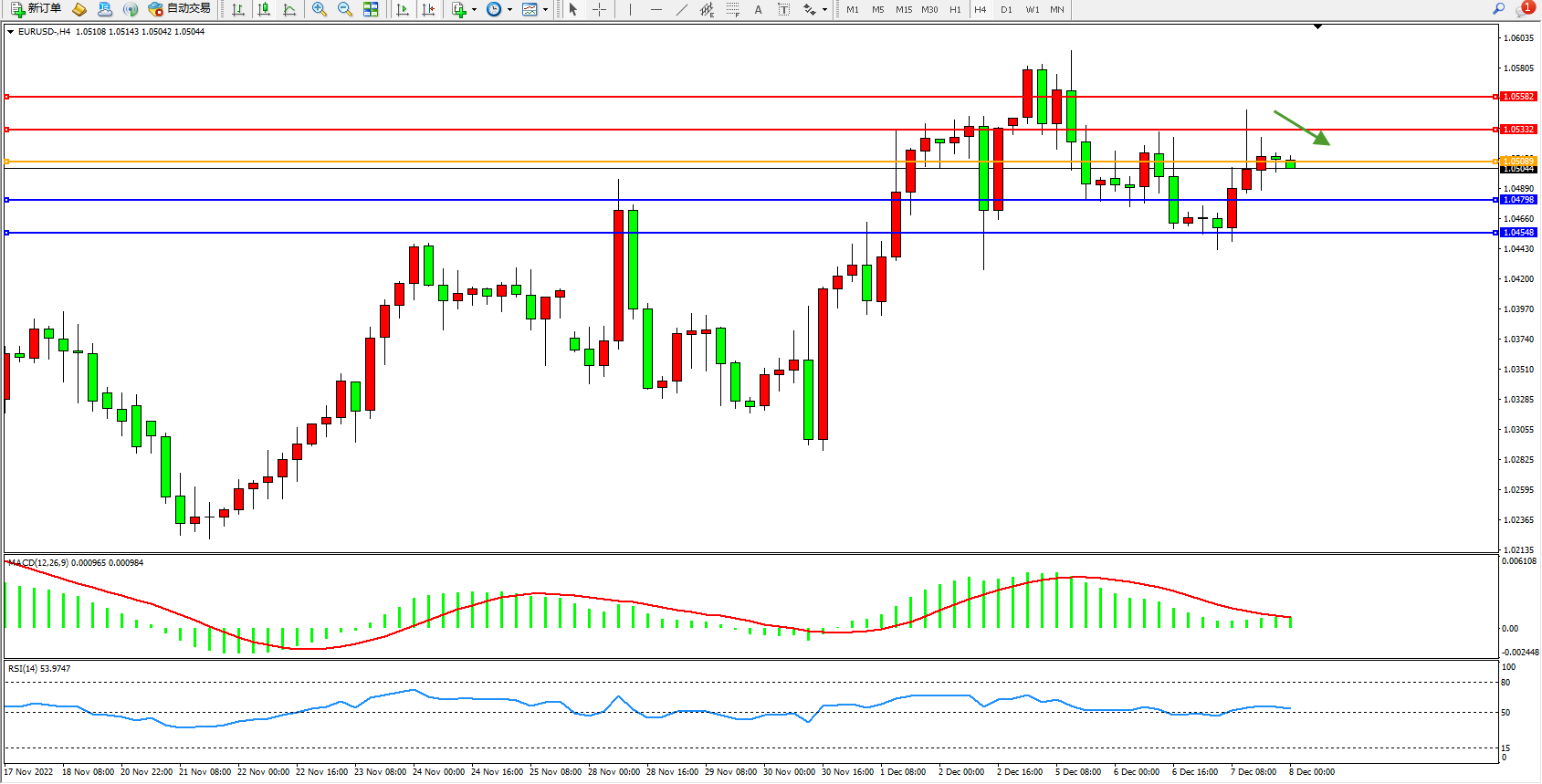 4小时图看:高位短期震荡回撤,短期跌势减弱,市场多头有伺机入场迹象,但整体依旧处于偏弱势,MACD指标处于0轴线上側弱势徘徊,RSI指标处于50均衡线上側弱势整理;