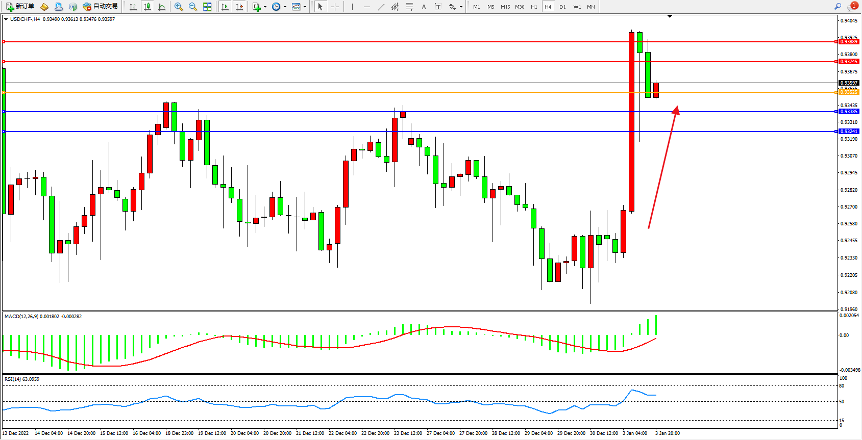 美元瑞郎USDCHF——4小时K线图显示: