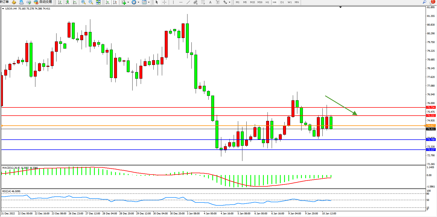 交易策略:74.617下方看跌,目标73.758、73.137