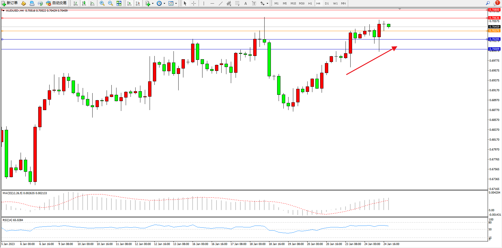 交易策略:0.70375上方看涨,目标0.70636、0.70800